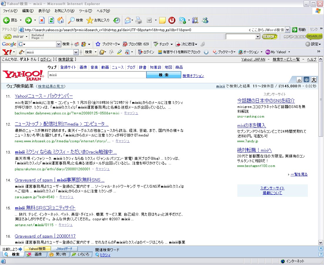 Yahoo! Japanで「mixii」と検索…