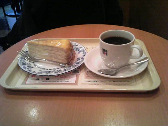 勉強に集中するため、珈琲(カフェインで眠気を吹っ飛ばす)と、ミルクレープ(糖分摂取で頭の回転を促進)を頼む…↓