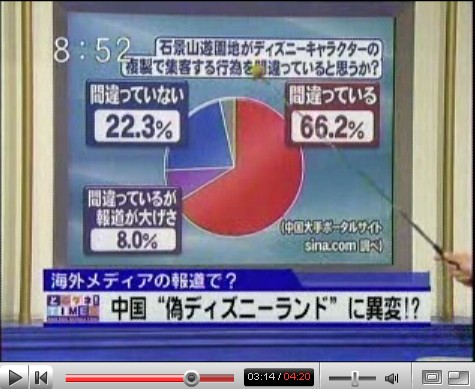 男性アナウンサー「石景山遊園地がディ○ニーキャラクターの複製で集客する行為を間違っていると思うか?というアンケートをとったところ、66.2%の国民が間違っている。じつは、間違っていないと思う人が22.3%もいて、間違っているが海外の報道が大げさという人が8.0%もいて、これだけソックリの偽キャラクター、コピー商品でも30%の人たちが『まぁ別にいいんじゃない?』という意識でいるところが中国の実態なのかもしれませんねー」